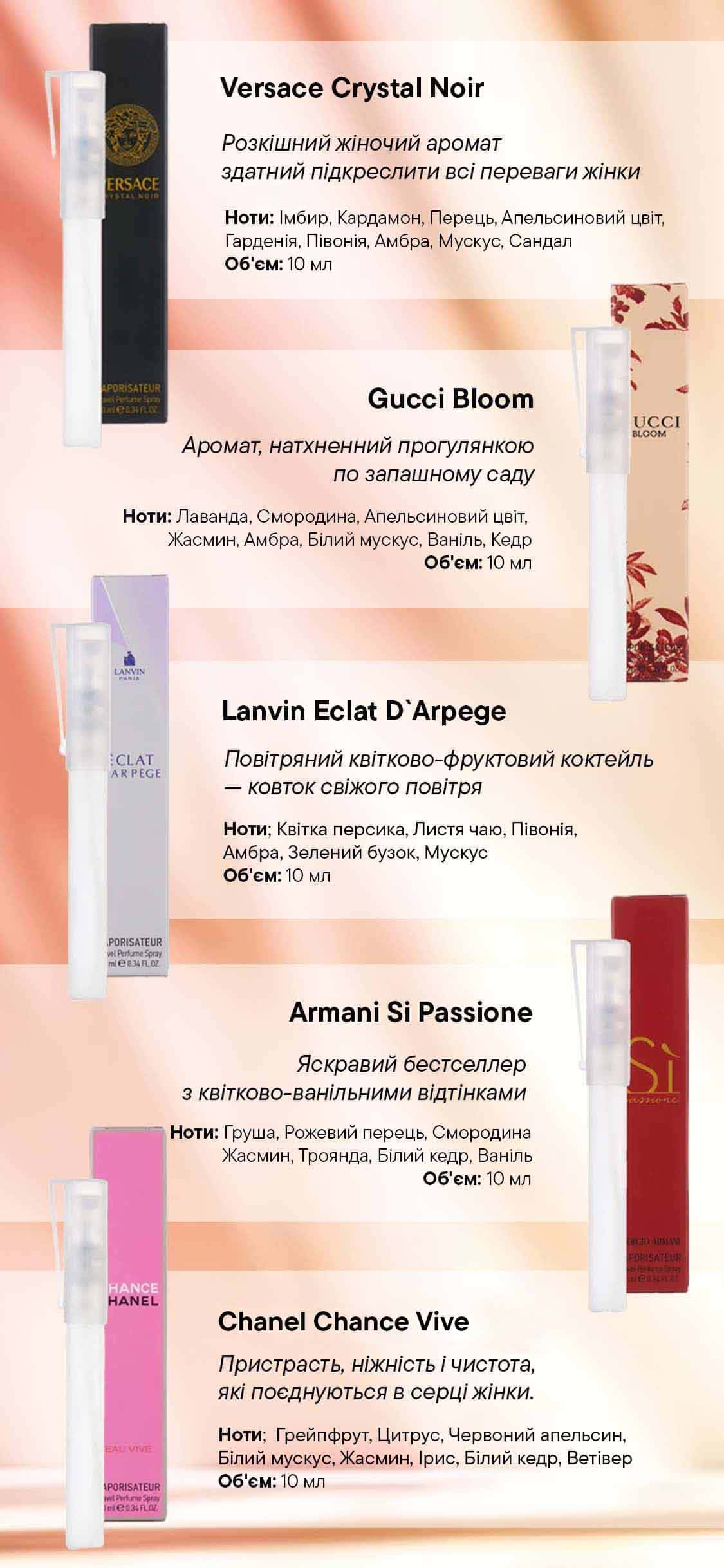 Тепер я маю аромати під настрій! Класний набір за таку ціну. Зручно носити в сумочці. Найбільше мені сподобались Кірке і Кіліан. З ними отримую багато компліментів.